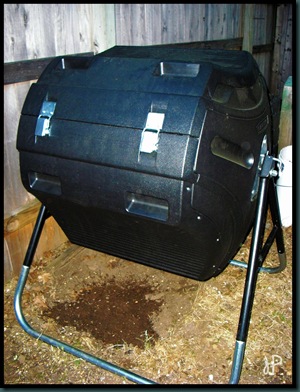 I purchased our tumbler at one of those large warehouse stores. Lovey was very kind to work till dark one evening putting it together. It had a lot of pieces. It was compared to an IKEA “put together”. Have you ever put together something from IKEA? I’m not not always sure it’s worth the savings. But any who… the lid lifts up to put in your composting materials. The pin on the right side slides out so you can tumble the contents. No more pitch fork turning by the mother. Tumbling is fun. At least that’s what you will tell your chilies.
